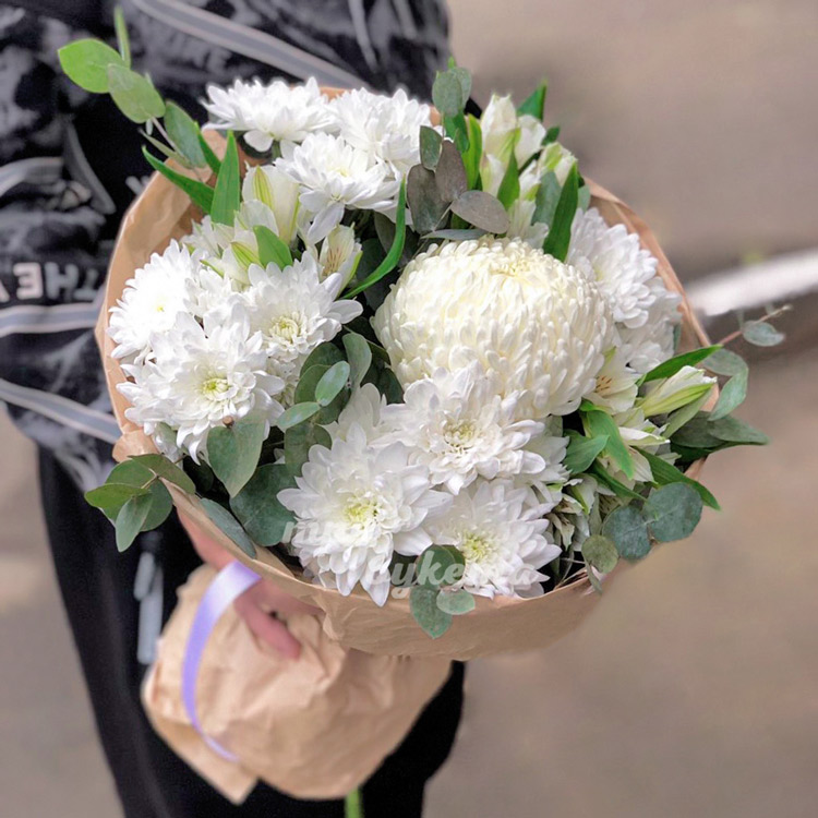 Белые хризантемы с эвкалиптом