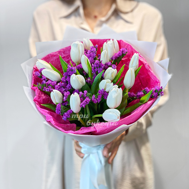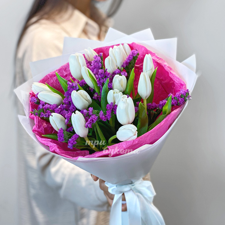 Букет белых тюльпанов со статицей