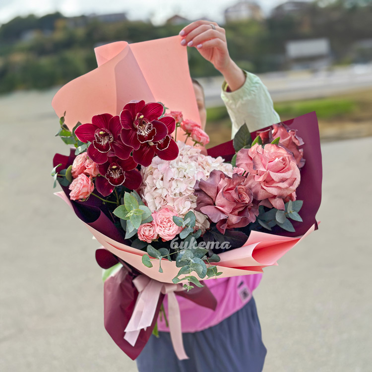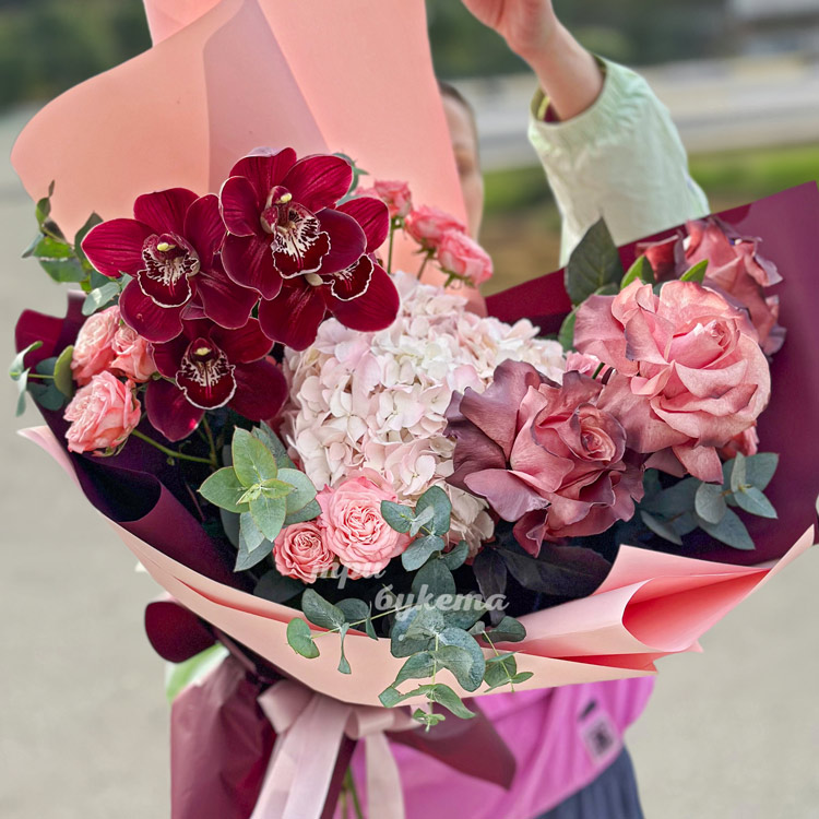 Букет бордовых орхидей и французских роз