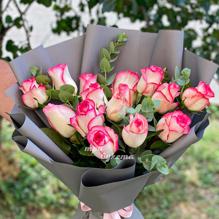 Букет из 15 розовых роз с эвкалиптом
