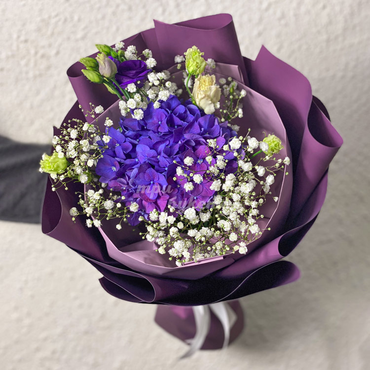 Букет из фиолетовых гортензий с гипсофилой