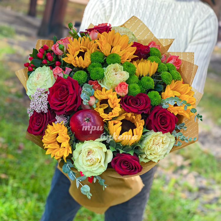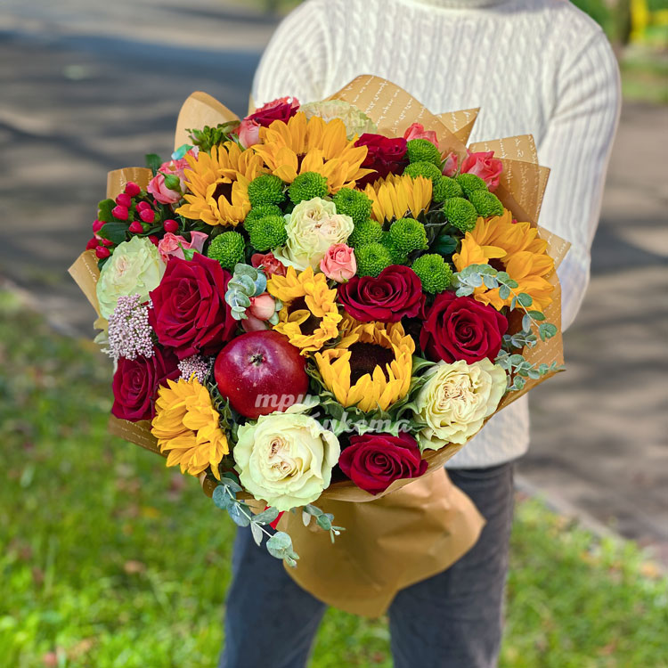 Букет из подсолнухов и роз с яблоком