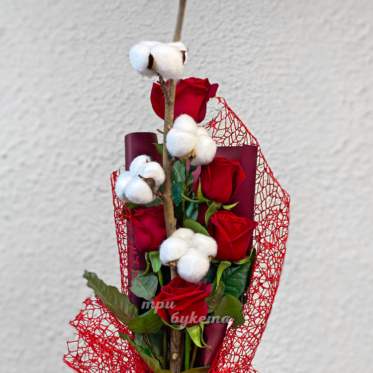 Букет красных роз и шариков хлопка
