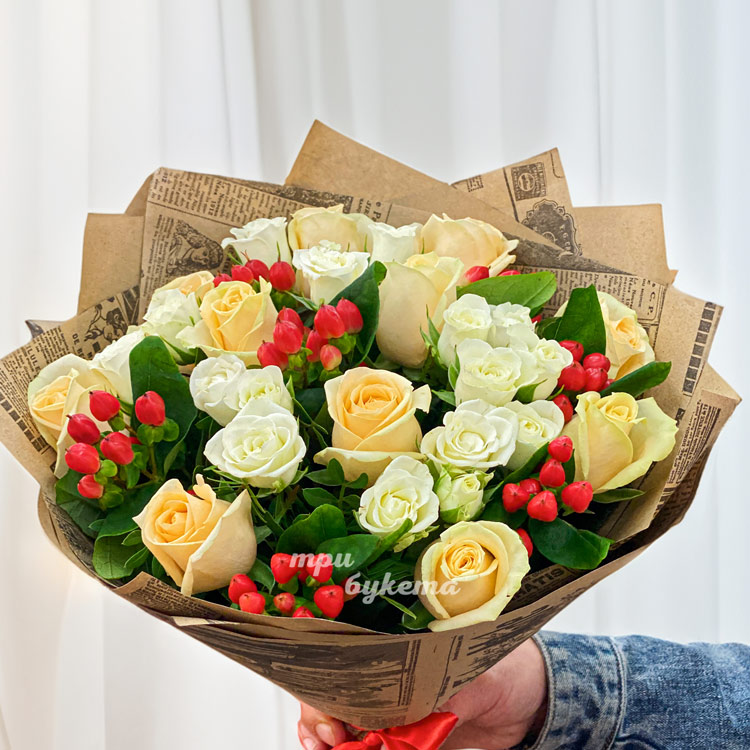 Букет кремовых и белых роз в крафте