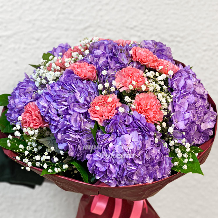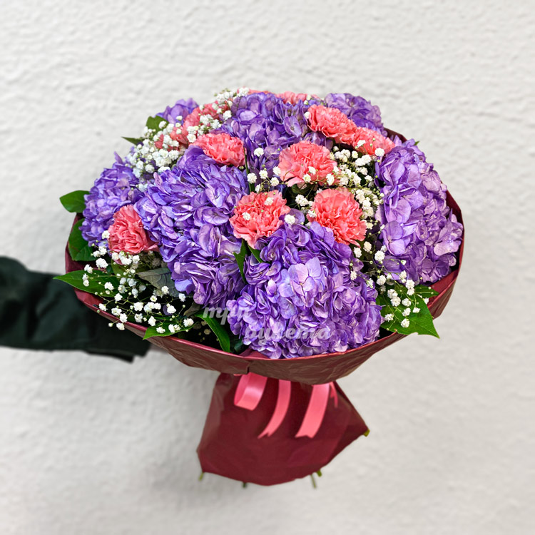 Букет сиреневых гортензий с гвоздиками
