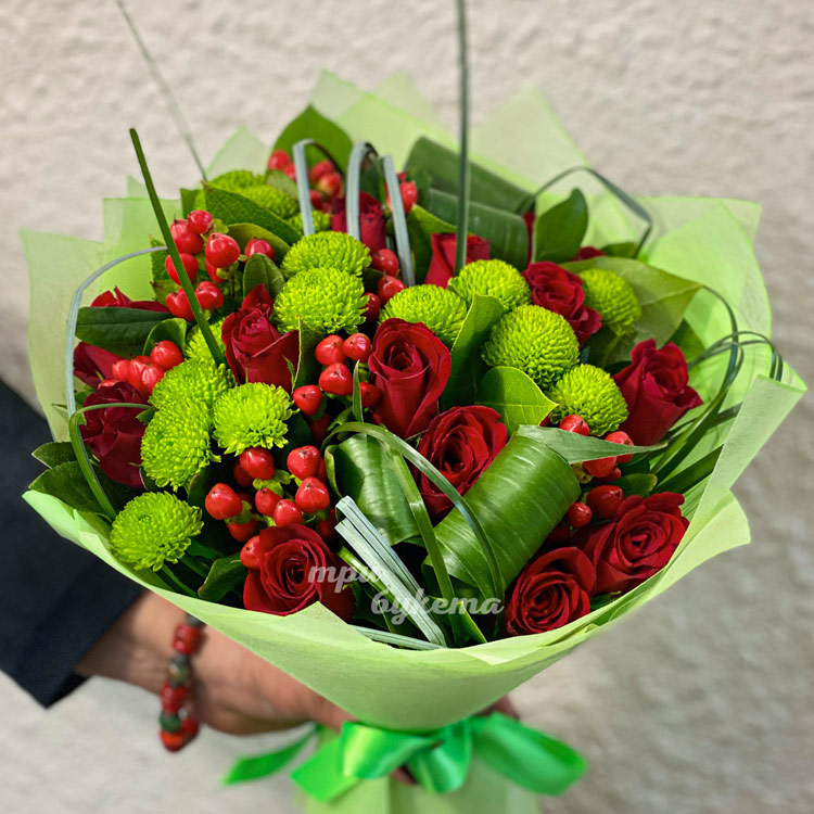 Букет зеленых хризантем и красных роз