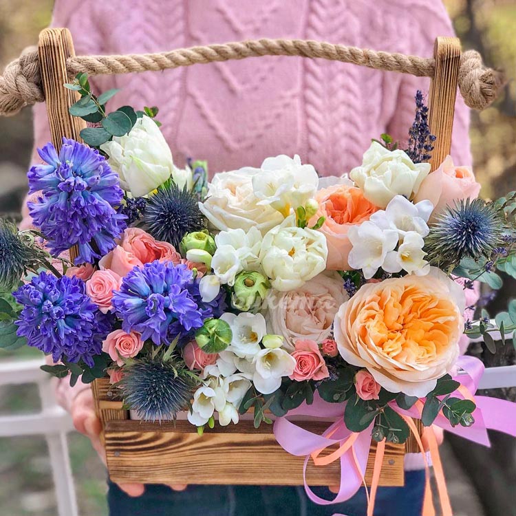 Фрезии, гиацинты и розы в ящике