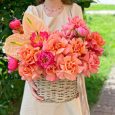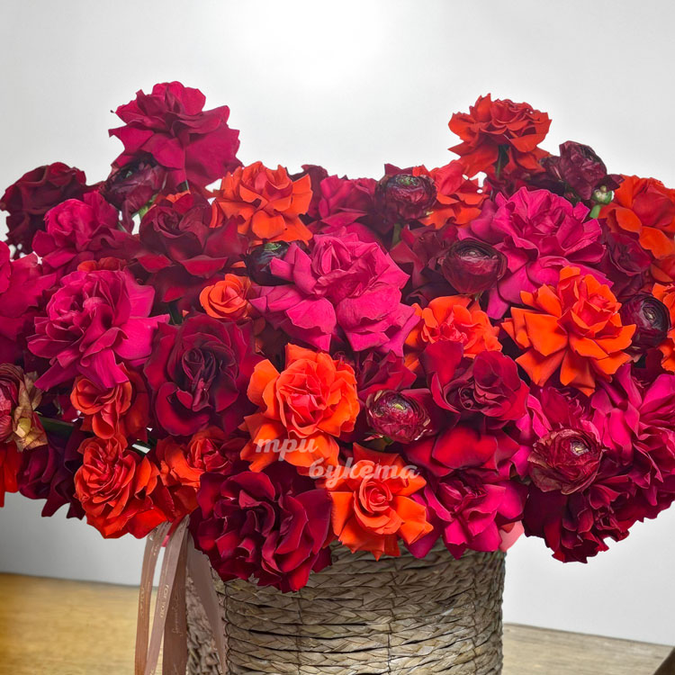 Кашпо бордовых, розовых и оранжевых роз