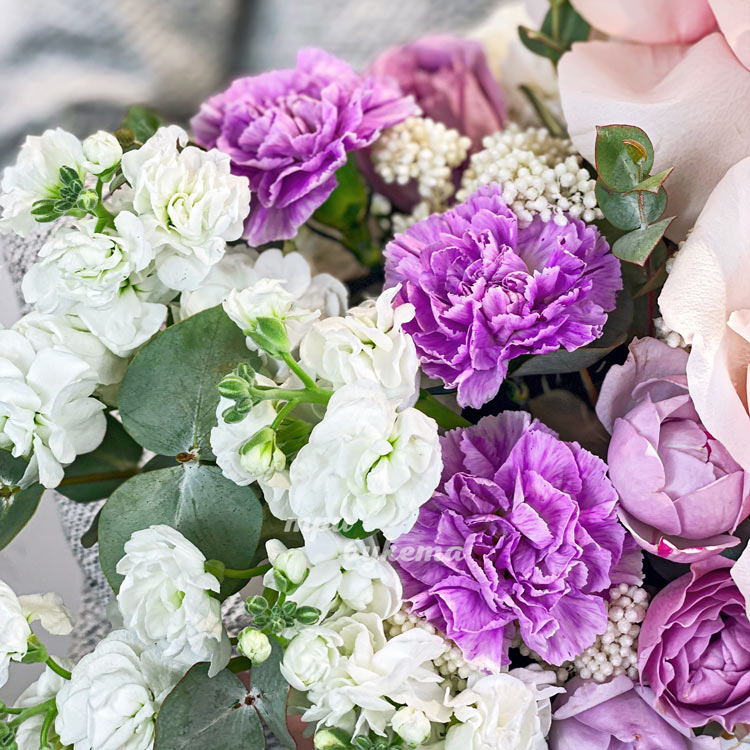 Коробка белых маттиол и сиреневых гвоздик
