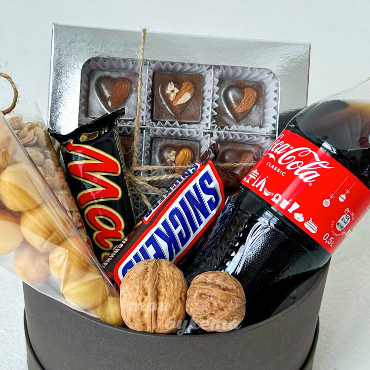 Коробка на 23 февраля с конфетами и снеками