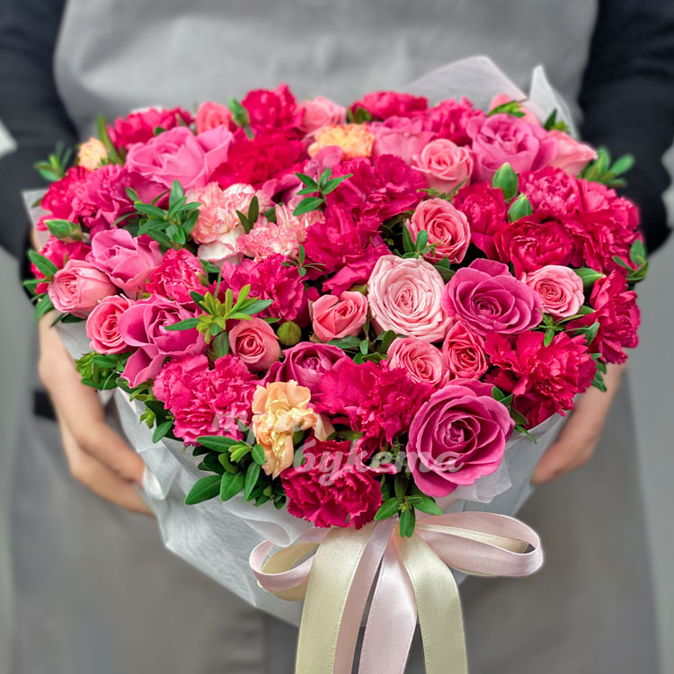 Коробка-сердце с розовыми гвоздиками и розами