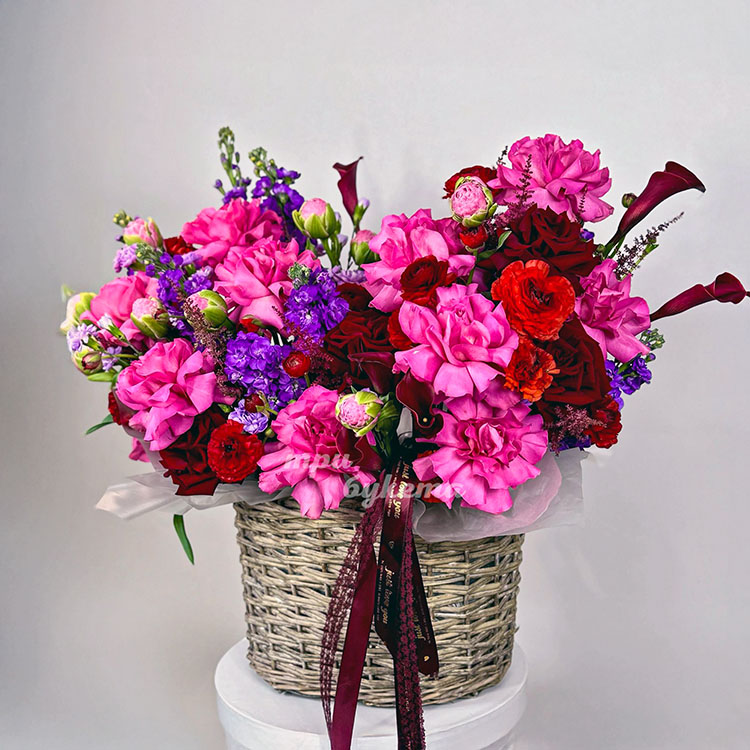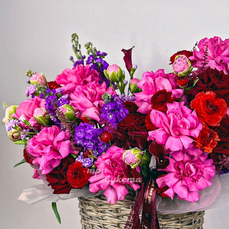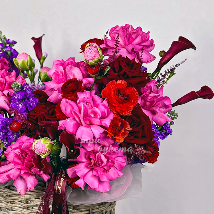 Корзина роз, маттиол, ранункулюсов и калл