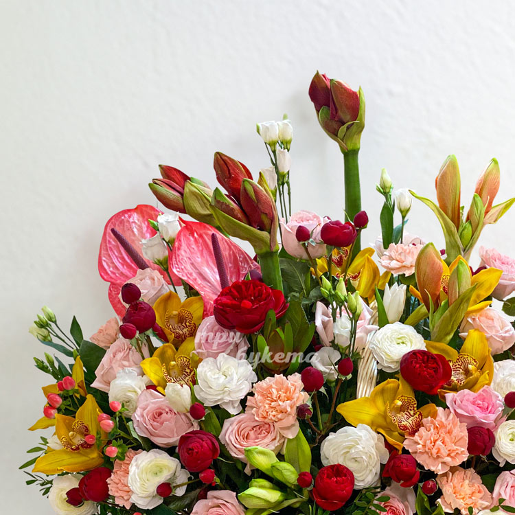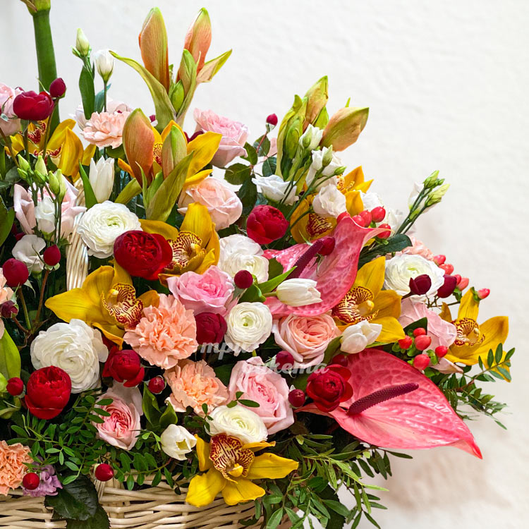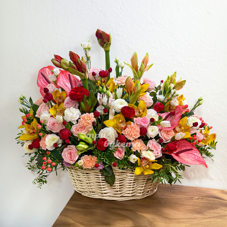 Корзина ярких роз, орхидей и амариллисов