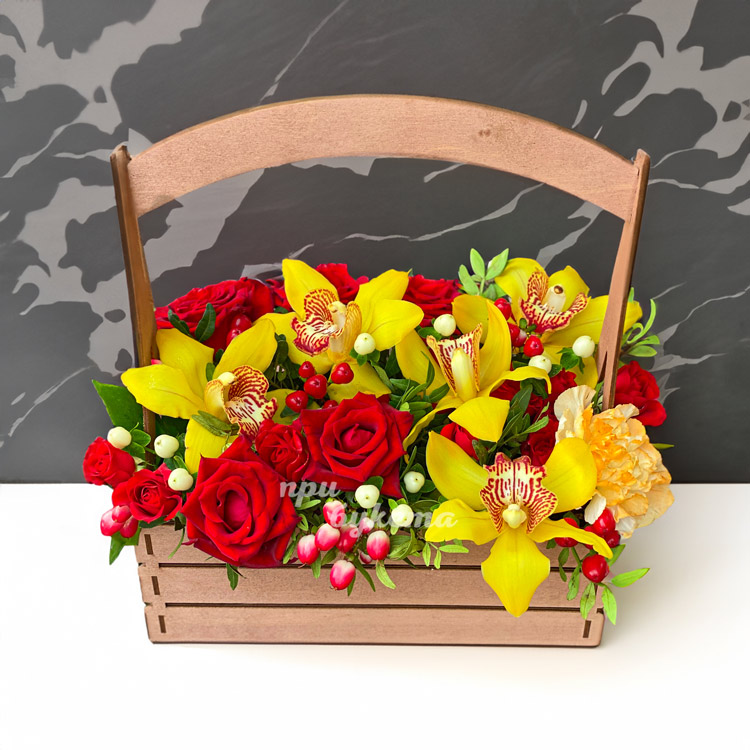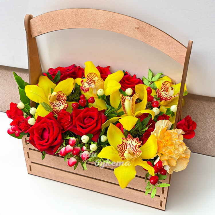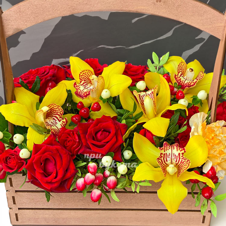 Красные розы и желтые орхидеи в ящичке