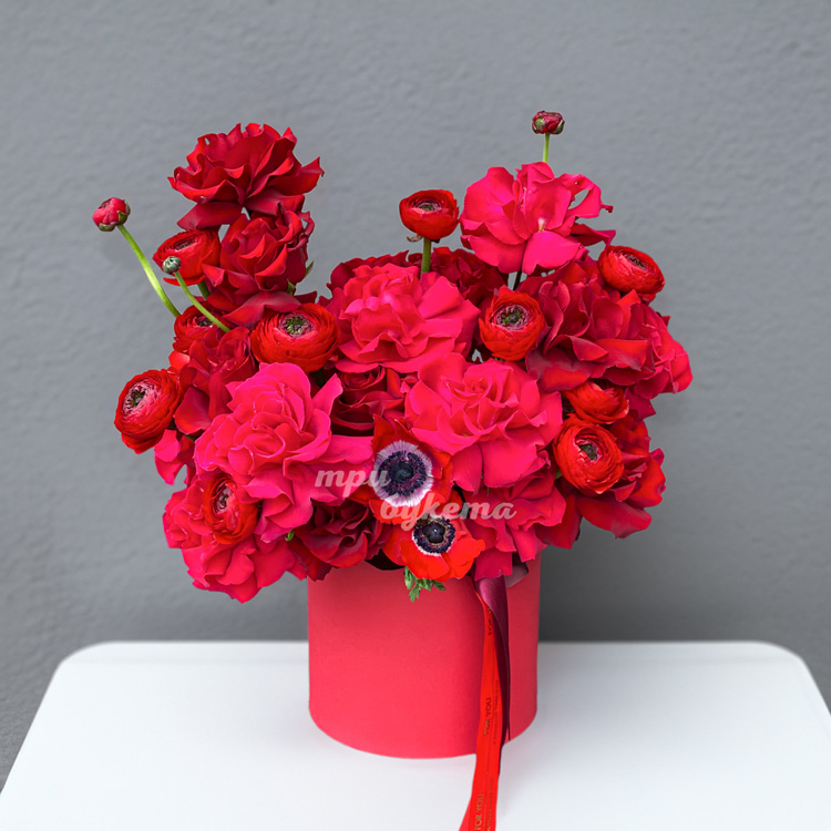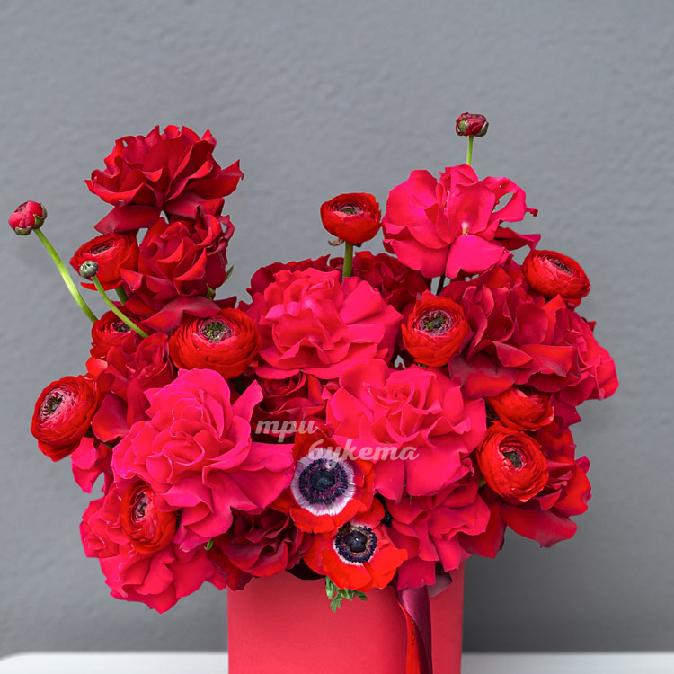 Красные розы, ранункулюсы и анемоны в коробке