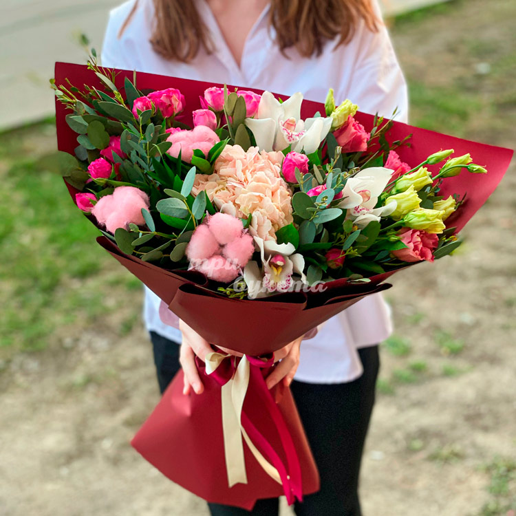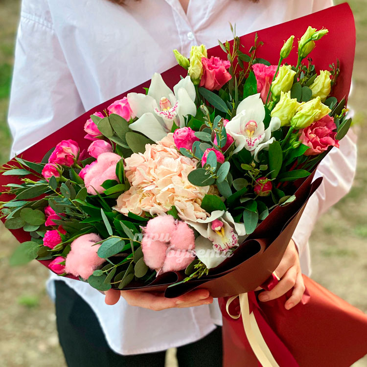 Красный букет с цветами и хлопком