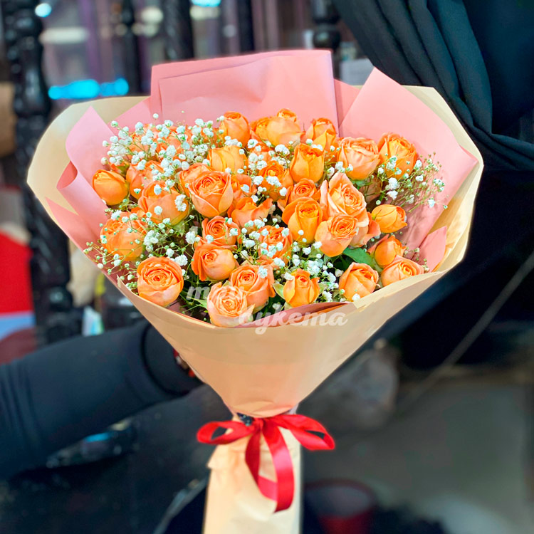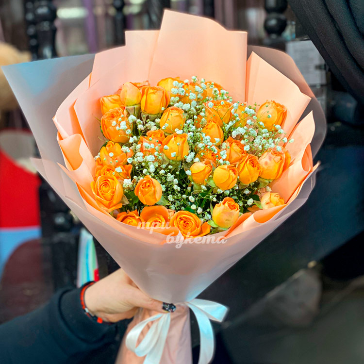 Оранжевые куст. розы с гипсофилой