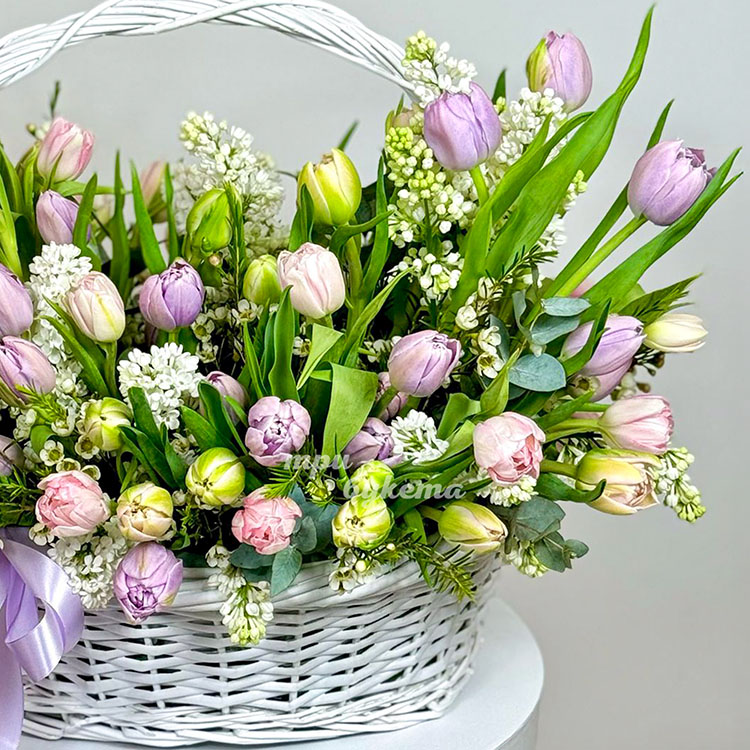 Пышная корзина с тюльпанами и сиренью