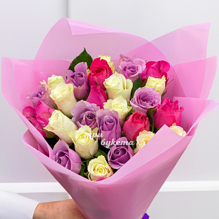 Розовый букет из 27 разноцветных роз