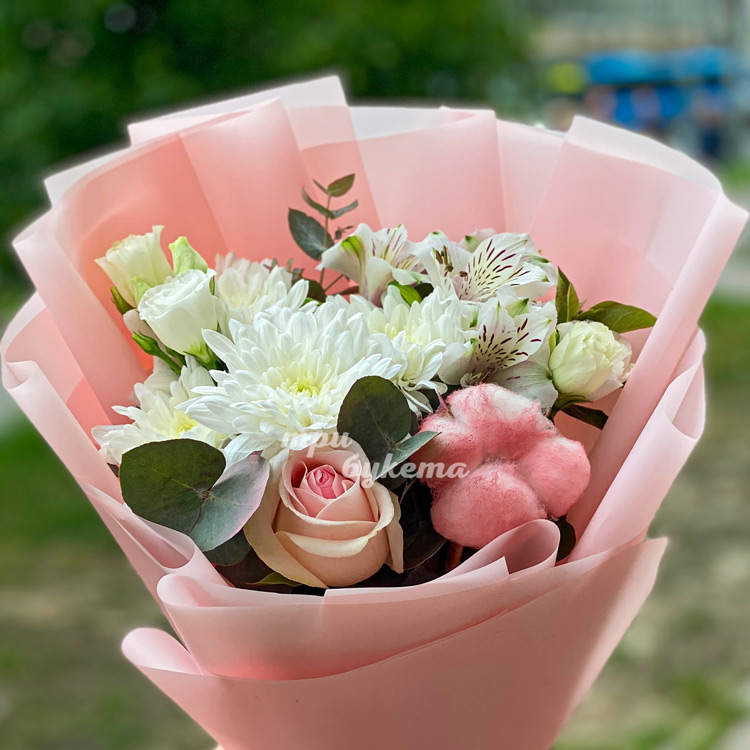 Розовый букет из белых цветов и хлопка