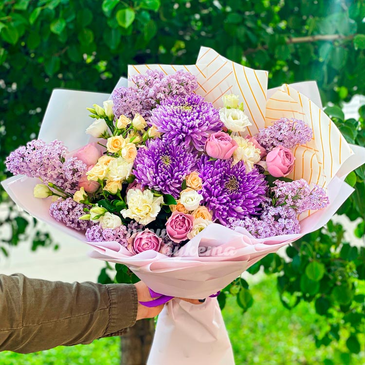 Сиреневый букет хризантем, роз и сирени