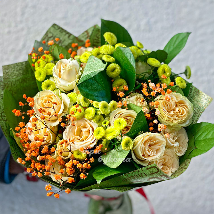 Зеленый букет кустовых роз и хризантем